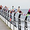 Notre "yarnbomber" a trouvé le lieu idéal pour présenter sa création la plus spectaculaire, posée sur la jetée en bordure de plage, soit une interminable écharpe de 50 mètres, ornée d'athlètes, de nageuses, de rameurs, d’ haltérophiles et de footballeurs, tous représentant une discipline des jeux olympiques.