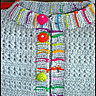 Une fois le tricot réalisé, elle s’attaque à la partie déco, elle rajoute des pièces tricotées, brode, trouve la bonne couleur qui va faire flasher l'ensemble et crochète autour des points de tricots....
