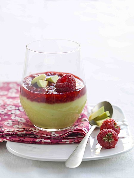 Panna cotta à l'avocat 03/06/2009 | Entrées | Louise Denisot 1 bel avocat, des framboises, de la crème légère, du sucre en poudre, 2 feuilles de gélatine