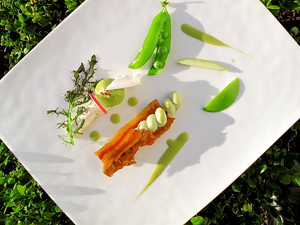 Recette du Petit pois en Millefeuille, ventrèche Ibaïona en vacherin, radis noir et Mamia de foie gras.