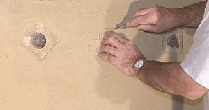 Le but est d'obtenir un effet de ce type avec un relief provoqué par l'épaisseur de l'enduit de finition qui laisse le motif en profondeur. ici, un cendrier carré en plastique, posé en losange, sert de gabarit.