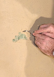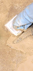 En tenant le couteau de peintre à environ 45°pour ne pas agresser le fond, grattez l'enduit de finition jusqu'à retrouver le corps d'enduit teinté. Essuyez ensuite minutieusement, sans toucher les bords, avec un chiffon propre légèrement humidifié. Laissez sécher tout l'enduit le temps nécessaire, soit 15 jours à trois semaines. |