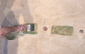 Préparez une eau pigmentée de type "fresque", c'est à dire simplement de l'eau mélangée à du pigment, pour l'appliquer sur le corps d'enduit frais.Une à deux cueillères à soupe de pigment dans 1/2 litre d'eau suffisent. |