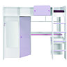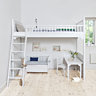 Sous le lit, le coin bureau se compose au choix d’une simple tablette de 50 cm de profondeur minimum sur toute la longueur de la mezzanine avec éventuellement un retour en L, ou bien d’un bureau complet avec tiroirs, placards et étagères.